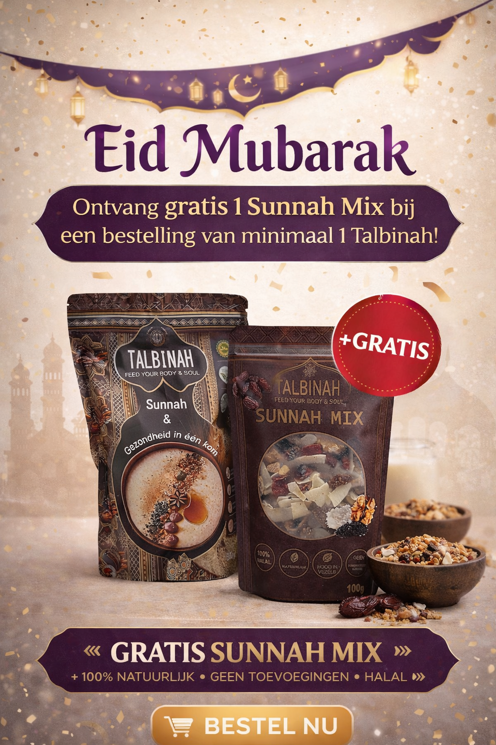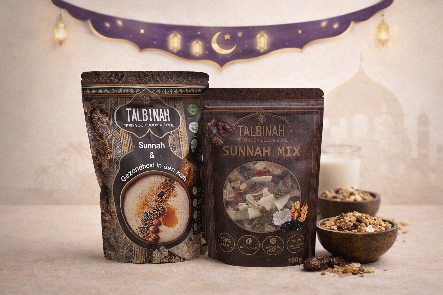 Talbinah is een romige, voedzame pap gemaakt van 100% volkoren gerstmeel, zoals aanbevolen in de Sunnah van de Profeet Mohammed vzmh. Rijk aan vezels, vitaminen en mineralen, ondersteunt Talbinah de spijsvertering, bevordert het een gezonde darmflora en geeft langdurige energie. Geniet van de zachte, natuurlijke smaak en verrijk het met honing, dadels of onze Sunnah Mix Topping voor een extra boost. Een puur en halal superfood dat lichaam en ziel voedt. Bestel nu en ervaar de kracht van Talbinah!